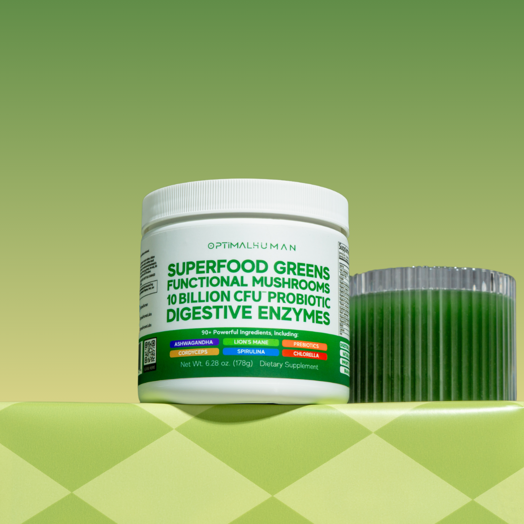 At the core of Optimal Human is the Nutrient-Rich Superfood Blend, featuring Spirulina, Chlorella, and Wheatgrass. These nutrient-dense superfoods provide antioxidants that help fight free radicals* and support cellular health*. This blend works synergistically with the Gut Health & Digestive Support Blend, which includes probiotics, enzymes, and prebiotics to improve digestion* and enhance nutrient absorption*.